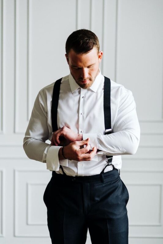 چه کت و شلوار مشکی زیبا بپوشید چه کت و شلوار تاکسیدو، همیشه باید ساسبندهایتان را با یک پیراهن باکیفیت ست کنید. یک پیراهن تاکسیدو با پارچه ضخیم و سفید همیشه یک انتخاب عالی است. به این ترتیب ساسبند، لباس شما را رسمیتری نشان خواهد داد و حتی میتوانید دکمههای سر دستتان را هم در این استایل به کار ببرید.